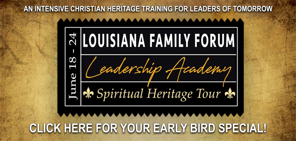 Are you ready to witness firsthand the origins and locations of America’s founding? Louisiana Family Forum (LFF) is assembling a first-class Worldview Team for the 2023 LFF Leadership Academy on June 14 – 24th. You could be a part of a select group of young leaders who walk in the footsteps of the Founding Fathers as […]